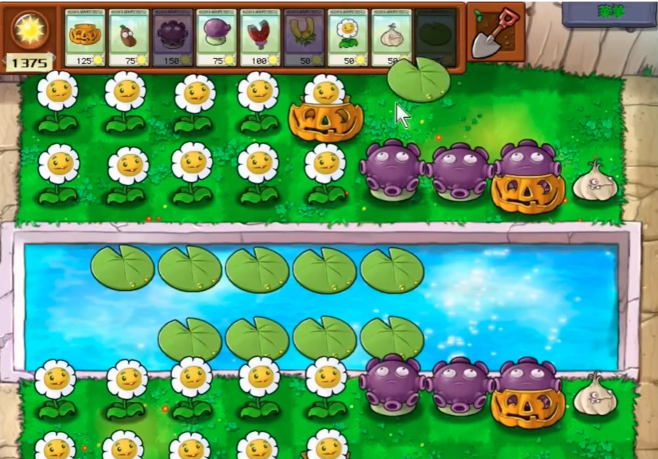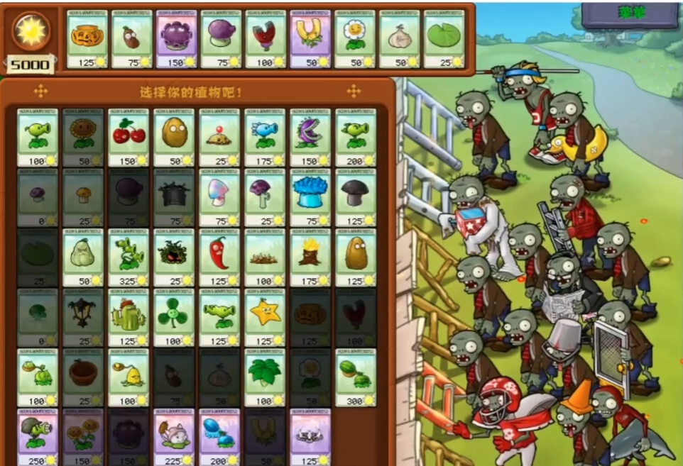 开局有5000阳光但不能种向日葵,所以咱们得精打细算。优先种忧郁菇和大蒜,忧郁菇能范围攻击,大蒜能把僵尸引到同一行集中消灭。记得留200阳光备用,随时补被啃坏的南瓜头或大蒜。金盏花是赚钱核心,种满后排格子,配合吸金磁自动收钱,一局下来轻松赚8000以上。