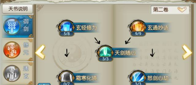 天书通玄线重点强化雷系群攻,雷云奇变提升唤雷诀伤害,风雷之怨直接加强神剑御雷的爆发。炼神还虚和焚心厉雷必点,前者减技能冷却,后者让真雷法衣附带吸血效果。修元线主要补续航,真元圣护回蓝、天仙护体回血,挂机刷本不用带药。如果天书点充足,第五卷优先点右边分支的雷神降世,进一步提升雷电伤害。
