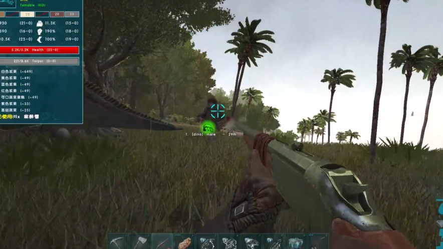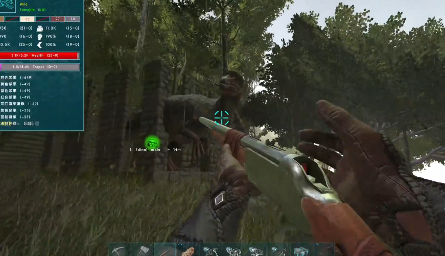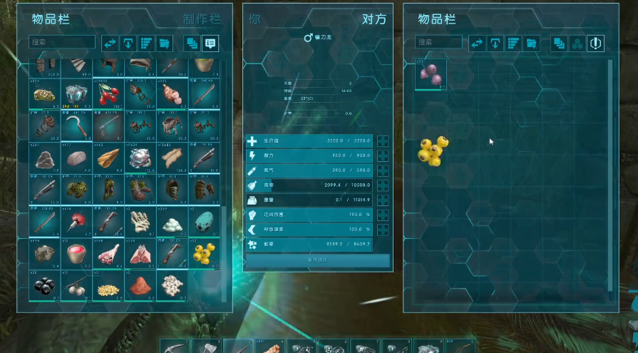 镰刀龙在驯服后具备多功能性,左键攻击可高效采集肉类、木材、兽皮等资源,右键则专用于采集纤维。其综合性能优于河狸、猛犸等专职采集生物,且战斗能力接近霸王龙,是中期过渡的理想伙伴。玩家可将其部署于内陆森林或平原附近的基地,便于执行采集任务。