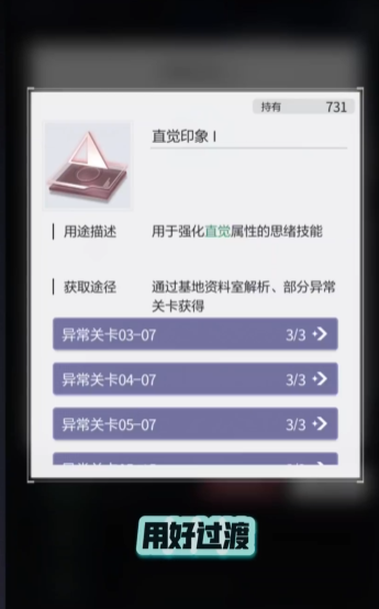 对于直觉印象的获取,玩家可以通过主线任务的异常事件调查以及基地资料室的分析功能。异常事件调查随着关卡推进难度提升,需要玩家具备一定的战力基础,因此建议在培养思绪的同时逐步解锁更高阶的副本。资料室的解析功能虽然产出种类繁多,但需要消耗时间等待审批,适合长期积累。逻辑印象II和III分别用于40-70级与70-100级的思绪技能强化,而直觉印象同样分为两个等级,玩家需根据思绪的成长阶段合理规划使用。