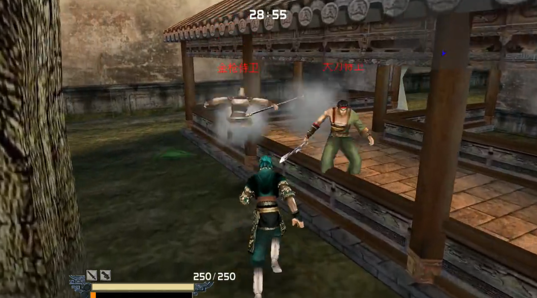 进入皇天城后,咱们先用长剑攻击前方的长枪哨兵,等大刀哨兵出现后立刻退回原位。在原位解决这两个哨兵后,记得丢掉火铳换上金枪装备。这个操作很关键,因为金枪在后续战斗中能发挥更大作用。从窗户进入阁楼后,上二楼用金枪解决野和尚甲和乙,这时候会出现两个蒙面人,把他们引到楼梯处逐个击破。