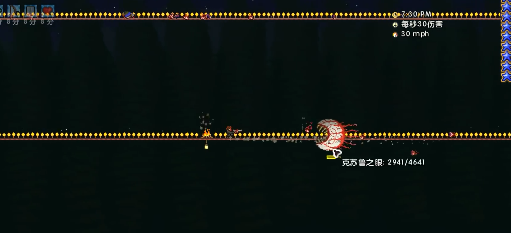 BOSS挑战需针对性准备装备与场地。克苏鲁之眼出现条件为生命值≥200且防御≥10,使用铂金弓配燃烧箭或手榴弹可高效击杀。击败后制作暗影/血腥套装,并利用掉落材料升级镐子进入猩红/腐化区域深处。史莱姆王可通过高空绳梯无伤打法获取坐骑,地牢入口需击败骷髅王后方可进入。所有BOSS战前需搭建至少200格的木质平台并放置篝火提升生命恢复速度。