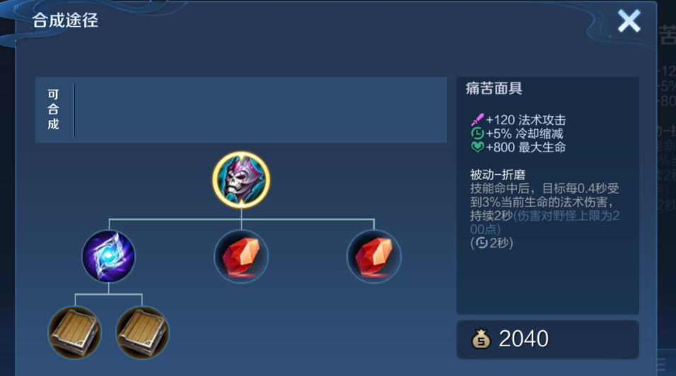 痛苦面具是一件非常不错的选择,它提供法术攻击、生命值和冷却缩减,属性很全面。它的被动效果能让技能伤害附带敌人当前生命值百分比的额外伤害,出魔女斗篷的敌人都有不错的效果。而且增加的生命值也让婉儿在切入时稍微耐抗一点点,容错率更高一些。如果敌方有蔡文姬、程咬金这类回复能力强的英雄,你需要把痛苦面具或者后续的一件装备换成梦魇之牙,用它的重伤效果来克制回血。