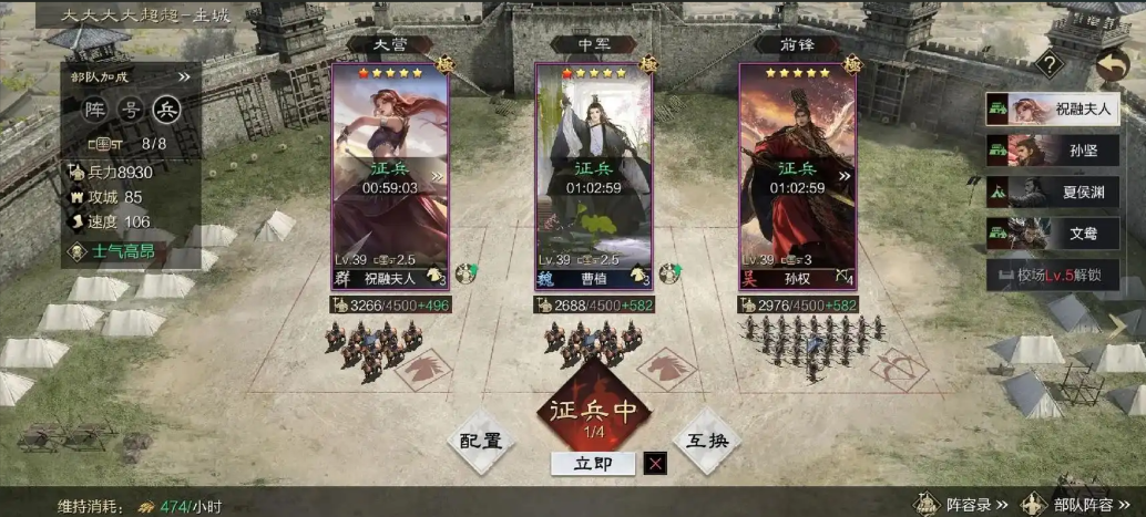 首先得把预备兵营建起来,你需要在个人技术里研究完预备兵营相关技术,然后找块建设用地消耗资源和政令来建造,一般需要四个半小时才能完工,如果你的同盟占领了郡城,建造时间还能缩短到三小时。建好后的预备兵营还可以升级,每次升级能增加5000的预备兵存储量和1000的预备兵训练量,最多能造六个预备兵营。有了兵营之后,还得安排一支队伍进去训练预备兵,每次训练会消耗20体力和2500铜钱,固定训练时间是12个小时,训练量兵营等级提升而增加,所以早点升级兵营对后期打仗补兵帮助很大。