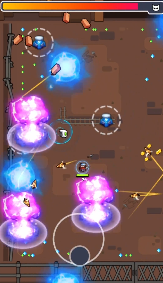 地雷和雷电发射器都属于可以选择的主动技能。一开始得到的地雷技能等级较低,它会在你周围设置一颗地雷,敌人踩到就会引发范围爆炸。需要不断刷关卡、打怪获取经验球来升级你的角色等级,每次升级都会出现三个新技能供你选择,多去选取地雷和雷电发射器这两个技能,才能随选择次数增加而提升等级。雷电发射器也一样,需要多次选中它来累计升级次数。