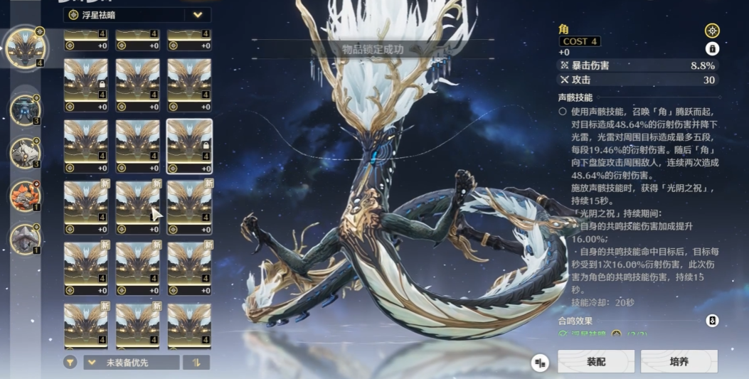 游戏内的角更准确地指向名为角的特定海啸级声骸,而非泛指角色。作为声骸系统的重要组成部分,它自身具备固定的属性与一套完整的效果。根据现有资料,角声骸属于衍射属性,其最核心的价值体现在为装备者提供衍射伤害的加成。它的合鸣效果浮星祛暗在装备两件套时能直接提升10%的衍射伤害,当装备五件套并在使用变奏技能登场时,更能使衍射伤害额外提升30%,持续15秒。这一机制决定了它为衍射输出型角色服务的基本方向,追求极致属性伤害的玩家会将其视为衍射体系的重要拼图。