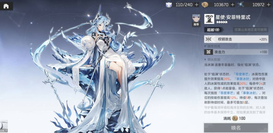 冰渊本身是一名远程冰属性输出角色,以卓越的范围伤害、高频的冰冻控制和流畅的技能循环著称,被普遍认为是开荒和后期都值得投入资源的强力角色。她的强度基础建立在高频率的技能释放与稳定的控制上,这使得她在没有专武时依然能凭借优秀的机制在队伍中担任核心输出或辅助控制的位置。专武星使·安菲特里忒的设计与她自身的技能机制深度绑定,将她本就强势的输出能力推向另一个台阶。