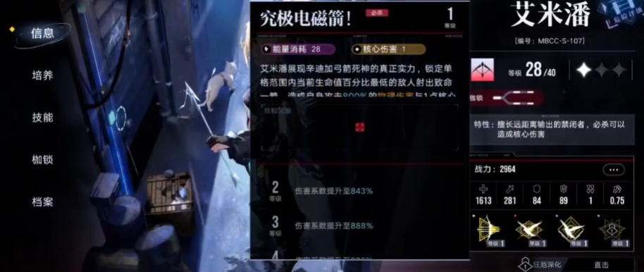 升阶至二阶是艾米潘发挥功能的关键节点。升阶不仅提升了她的基础属性,更重要的是解锁或强化了其核心战斗机制。她的必杀技究极电磁箭拥有高倍率的单体伤害并附带1点核心伤害,且在击杀敌人后可刷新充能。这一机制在二阶得到充分发挥,使其在应对前中期关卡中的精英单位或需要精准破核的场景时表现出色,能够有效处理那些威胁较大的单体目标。