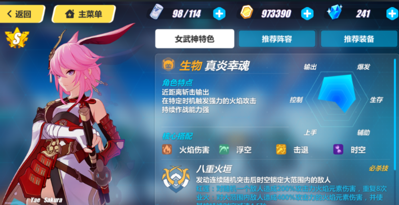 真炎幸魂的优势在于她的火元素爆发伤害,技能设计让她的攻击范围广,AOE效果出色,能迅速清屏打群架,这在日常任务和活动副本里特别实用。她的被动技能还自带点燃效果,持续烧血给敌人附加额外伤害,配合一些火伤圣痕和武器,输出直接拉满,打Boss时一套连招下去就能秒掉大半条血。操作上也不复杂,新手玩家也能轻松上手,不用太讲究手法,就能打出高伤害数字,这种简单粗暴的风格让她在玩家圈子里很受欢迎。她的缺点也很明显,比如防御力偏低,容易被集火秒掉,得靠走位和队友支援来弥补,但她的综合实力在三个八重樱里排第一,适合追求效率和爽快感的玩家。