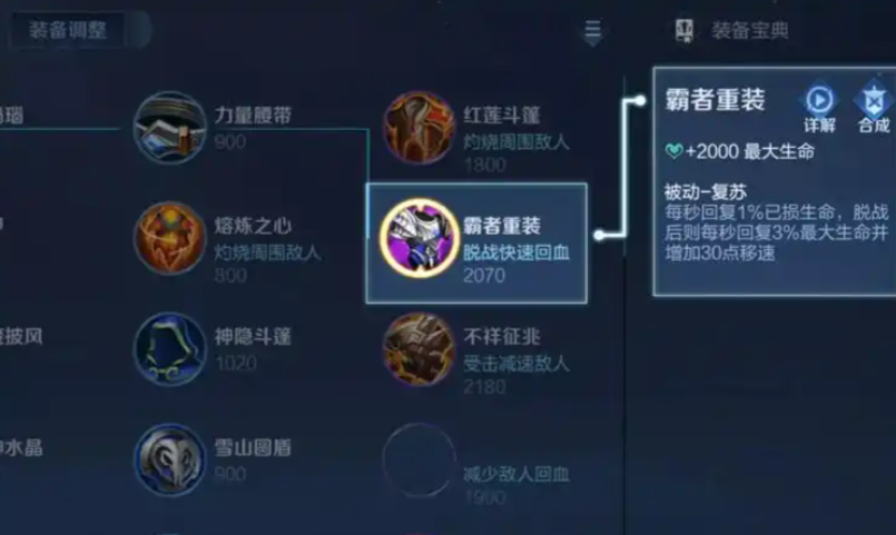 到了游戏后期,出装的选择更需要针对性的灵活调整。霸者重装能提供巨大的生命值加成和脱战回复,让你在长时间拉扯和频繁的团战间隙能保持健康状态,无需频繁回城补血从而可以持续占住关键视野。而贤者的庇护(复活甲)则是一次关键的保命选择,它能赋予你第二条生命,尤其适合那些需要冲进人堆里打控制的开团型坦克辅助。在复活甲进入冷却后,也可以考虑替换为血魔之怒等装备来获得护盾,进一步提升生存能力。