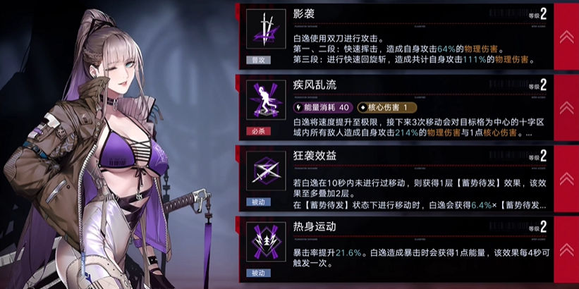 白逸的技能组紧密联动,塑造了她独特的操作节奏。她的必杀技疾风乱流是其灵魂所在,启动后接下来的三次移动会对目标十字范围内的所有敌人造成高额物理伤害及一点核心伤害,并且每次通过该效果移动后都能获得可叠加的暴击率提升。这意味着一次充能完备的释放,理论上最多能造成总计九段的范围伤害与三次破核,清杂与击破精英单位的能力十分突出。她的被动狂袭效益鼓励间歇性的静止,以获得移动后的攻击力加成;而热身运动则永久提升暴击率,并在暴击时为白逸回复能量,形成了暴击回能、开大移动、移动加暴击的良性循环。