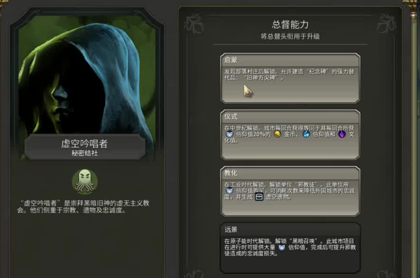 玩巴比伦文明时,最推荐的秘密结社是虚空吟唱者。这个结社能有效弥补巴比伦文明文化发展相对薄弱的短板,为其惊人的科技跳跃能力提供至关重要的文化支持,使得科技与文化的进步更加均衡,从而顺利推进各种胜利路线。