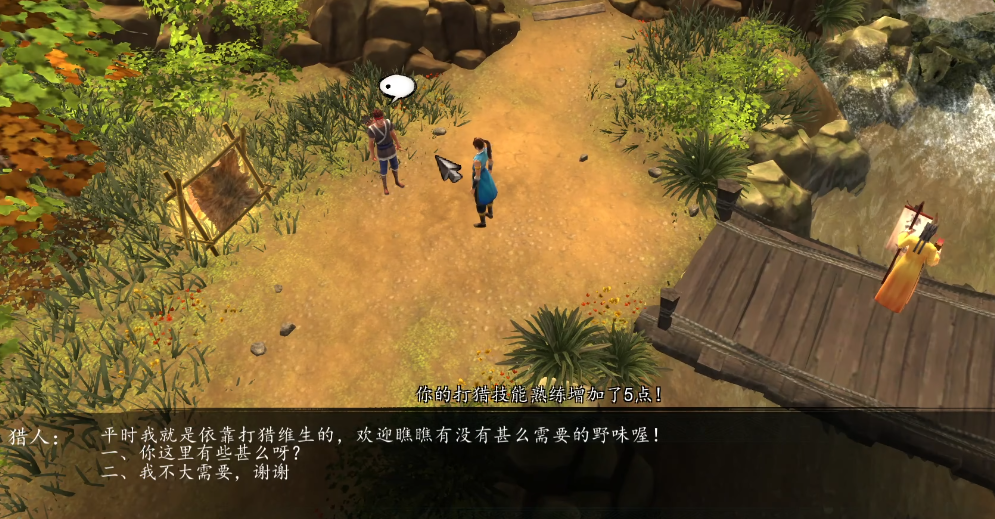 猎人任务需先对话获取弓箭,随后狩猎获取熊掌和虎鞭。熊掌可交给酒馆门口的杜鹃完成猎人求爱任务,虎鞭则交给河边少妇换取乐理技能书。洞穴老虎任务需与樵夫对话后前往村北林道,实际对手为贼人喝,战斗由谷月轩单独完成,胜利后开启洞穴内宝箱,需用钥匙解锁九宫格机关。酒鬼吕阿志的治疗任务需从郎中处获取药物,选择添加砒霜会降低道德但增加悟性。