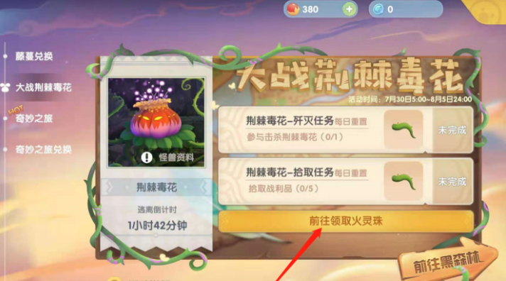 火灵珠主要用来对付荆棘毒花这个难缠的对手。拿到火灵珠后直接点击投掷就行,不需要瞄准,每次能造成20点伤害,如果有装备加成可以提升到25点。记得每天18点到22点这个时间段去挑战荆棘毒花,这时候boss会苏醒,击败后还能获得额外奖励。建议多准备些火灵珠,单靠一个可能不太够用。
