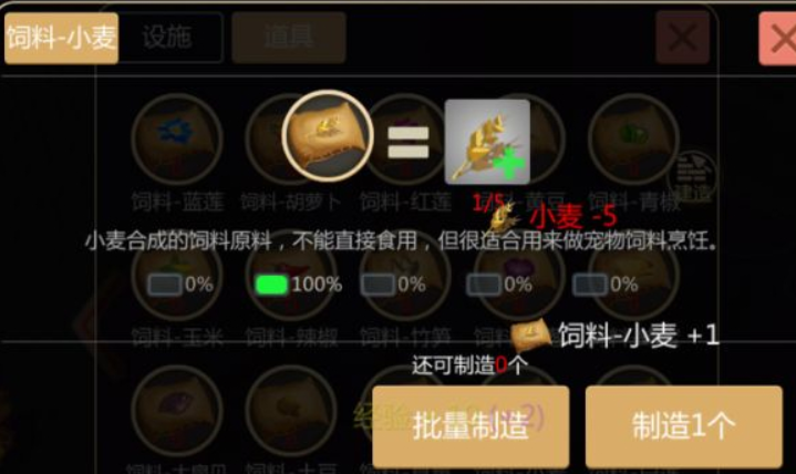 采集到小麦后,需通过工作台进行合成。打开工作台制作界面,选择道具标签页,找到饲喂原料分类下的小麦饲料包选项。点击后可根据当前小麦数量调整制作数量,支持单个或批量制作。批量制作能节省重复操作时间,但需确保背包空间充足。制作过程无需额外材料或工具,但工作台是必要设施,若未建造需提前准备木材合成。