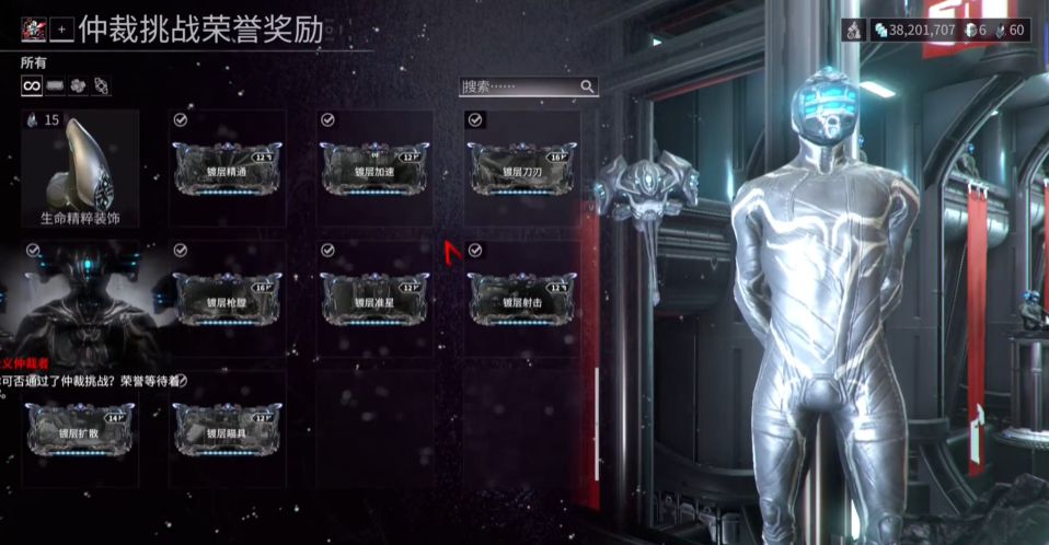 最后均衡仲裁者房间的左手边有个叫仲裁阁下的NPC,咱们的生息精华就是在他这儿兑换物品的。镀层MOD对战力提升帮助很大,优先换这些准没错。如果还有多余的精华,可以考虑换赤毒来洗紫卡,或者换阿耶檀识星星来分解内融核心。