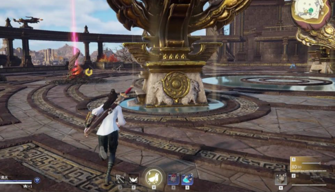 记清楚箭头方向后,咱们就可以回到广场调整雕像啦。用远程武器或者近战攻击都能让雕像旋转,每次攻击会让它转向固定角度。调整时记得面向钟的位置作为北方基准,这样不容易搞错方向。比如密室左上角箭头朝下,咱们就得把左上雕像的嘴朝向南方。四个雕像都调对方向后,广场中央会刷出宝箱,里面可是有好东西等着你哦。