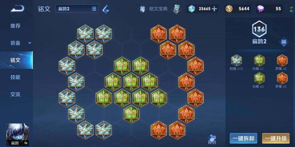 铭文搭配有两种,一种是9个梦魇、1个凶兆,3个调和、7个狩猎,10个心眼。另一种更极端的搭配是10个梦魇、10个狩猎、10个心眼。这些铭文主要提供法术穿透、攻击速度、移动速度和少量生命回复。攻速能帮助你更快地用普攻叠毒,移速能弥补扁鹊腿短的缺点,方便走位和支援,法术穿透则是伤害的保证。