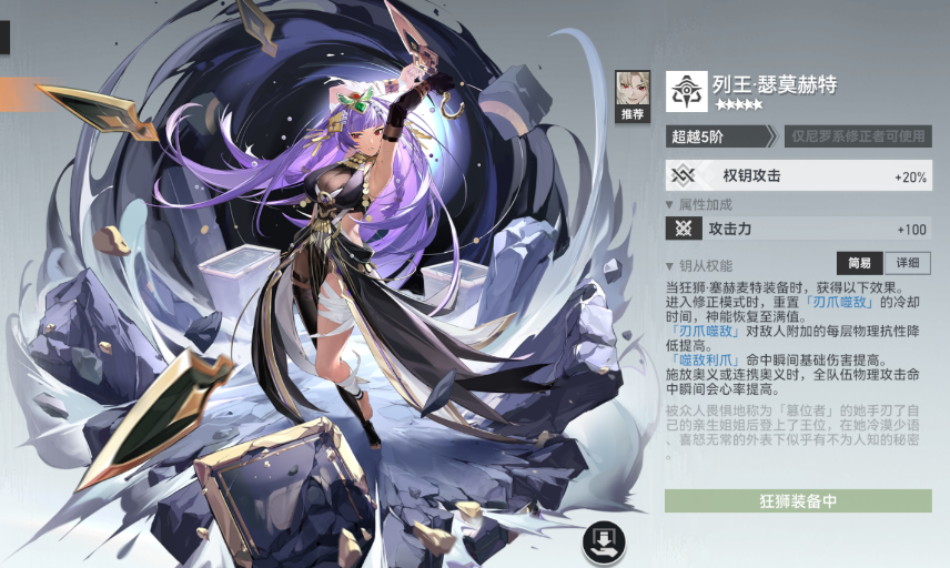 或许会考虑使用五星通用型物理钥从作为过渡。虽然通用钥匙也能提供攻击力、暴击率等基础属性加成,但它们无法触发列王瑟莫赫特特有的、针对狂狮技能机制与团队辅助的精准增幅。特别是缺失了全队物理会心率提升这一关键团队拐效果,会让狂狮在物理队中的战略价值大打折扣。若决心培养狂狮并让她在物理队伍中担任重要辅助位置,抽取并装备其专属权钥是性价比最高、也是最能体现其角色价值的投入。
