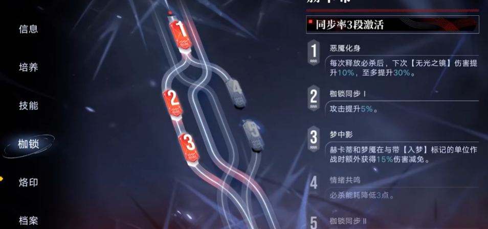 赫卡蒂的枷锁同步提升主要增强其攻击属性与技能效能。其一阶枷锁恶魇化身能在释放必杀后提升自身技能伤害;二阶与五阶枷锁枷锁同步直接提供攻击力百分比加成;四阶枷锁情绪共鸣则降低其必杀技能的能量消耗。这些加成全方位优化了她的输出循环与伤害能力,使其作为法术输出兼破核手的角色定位更为稳固。解锁枷锁是提升任何禁闭者实战能力的重要途径,对于赫卡蒂而言也不例外。
