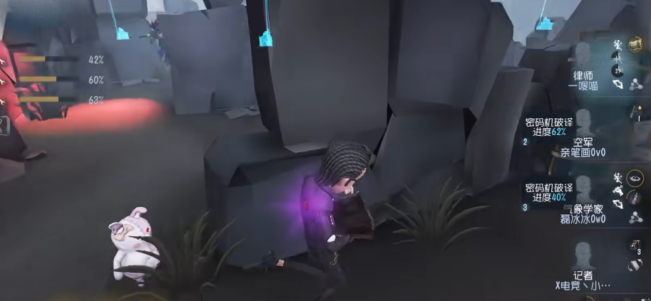 杰克应利用移动速度和隐身优势,快速接近并锁定律师。开局时,杰克需要快速解锁技能,通过追击求生者积累存在感。一旦进入雾隐状态,杰克可以悄无声息地接近律师,避免过早暴露。在雾区中,杰克的隐身速度缩短,移动速度大幅提升,这使得他能在律师修机时迅速发起攻击。杰克应谨慎攻击,确保在贴近律师后再出手,以避免因攻击落空而失去目标。杰克还可以利用雾刃进行远程攻击,在律师修机或移动时预判其位置,从而有效命中。