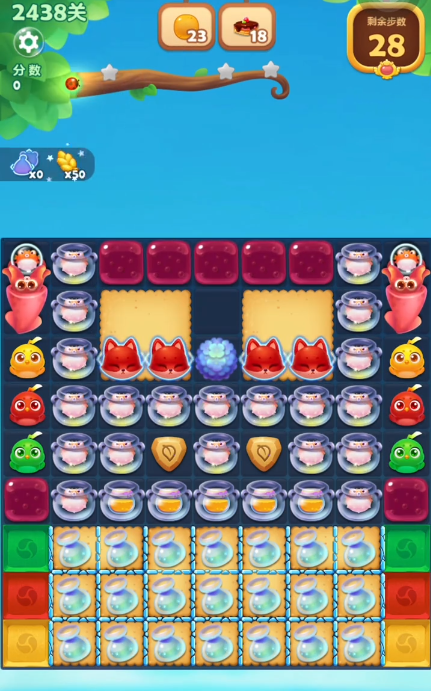 第2438关需要在规定的25步之内消除26个蜂蜜和6个蛋糕才能成功过关,这一关是固定开局,玩家第一步需要交换关卡中间位置的两只狐狸,完成这个交换后可以瞬间激活花团并消除掉全部的毒液,同时关卡左右两侧的闪电鸟会掉落并形成彩虹盘,紧接着会引发三次联动特效,这三次联动可以消除掉所有的魔法药水。