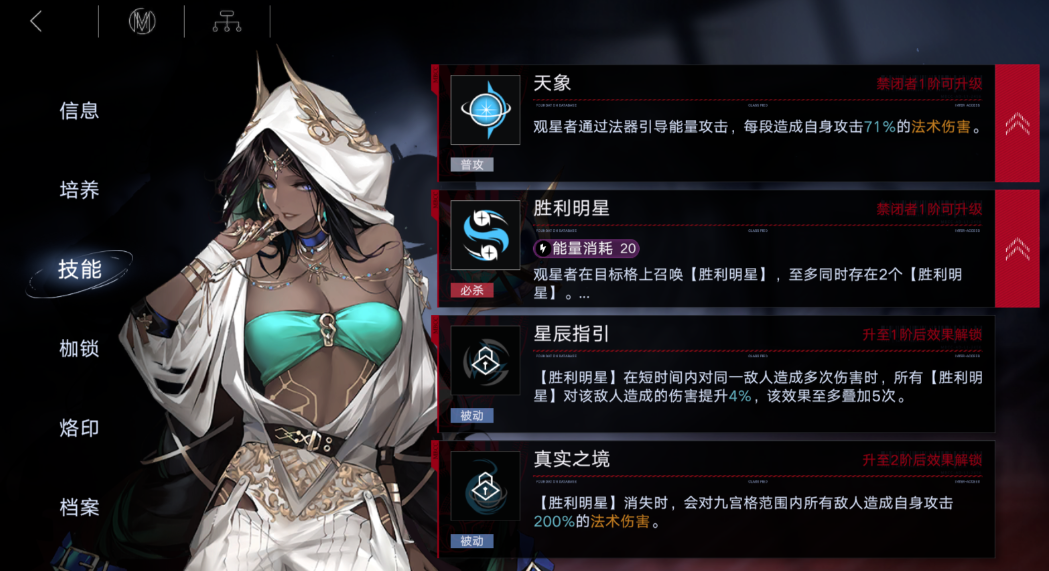 观星者主要通过召唤胜利明星进行输出,因此给其搭配烙印的核心思路是最大化提升召唤物的伤害与作战效能,最契合的毕业组合是侍奉者、造物与狂欲之城这套搭配。造物能够直接提升胜利明星造成的伤害,其增加的生命属性也会同步增强召唤物的生存能力。侍奉者则能在胜利明星攻击时概率为观星者回复能量,加速其必杀技的循环,从而更频繁地召唤或引爆明星来制造伤害。狂欲之城提供的攻击与生命加成同样能有效反馈给召唤物,综合提升输出与坦度。