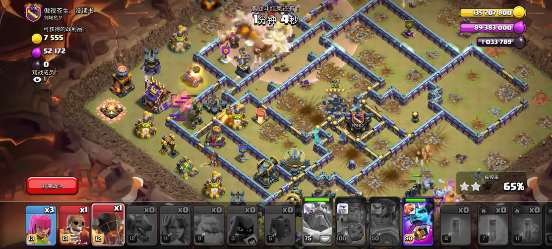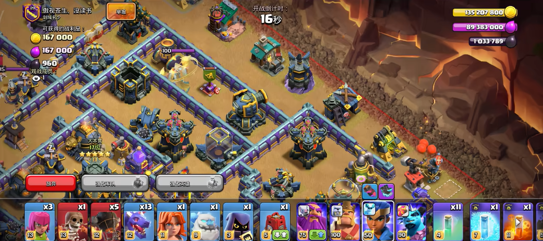 隐身战术的高阶运用讲究节奏与衔接,隐身法术需连续投放保持覆盖无断档,常用在飞艇爆本、闰土攻坚、超级部队突进等场景,投放时机选在单位进入防御射程前一刻,确保全程不被锁定。面对多头地狱塔、连弩等持续输出防御,隐身能让部队无伤贴近输出,搭配地震法术破坏城墙后,可快速分割战场逐个清除防御。防守端的隐形弹簧与隐形炸弹同样运用隐身逻辑,隐藏在资源建筑与城墙缝隙,针对哥布林、矿工等偷资源单位,触发后造成高额伤害或直接弹飞,打乱敌方进攻节奏。