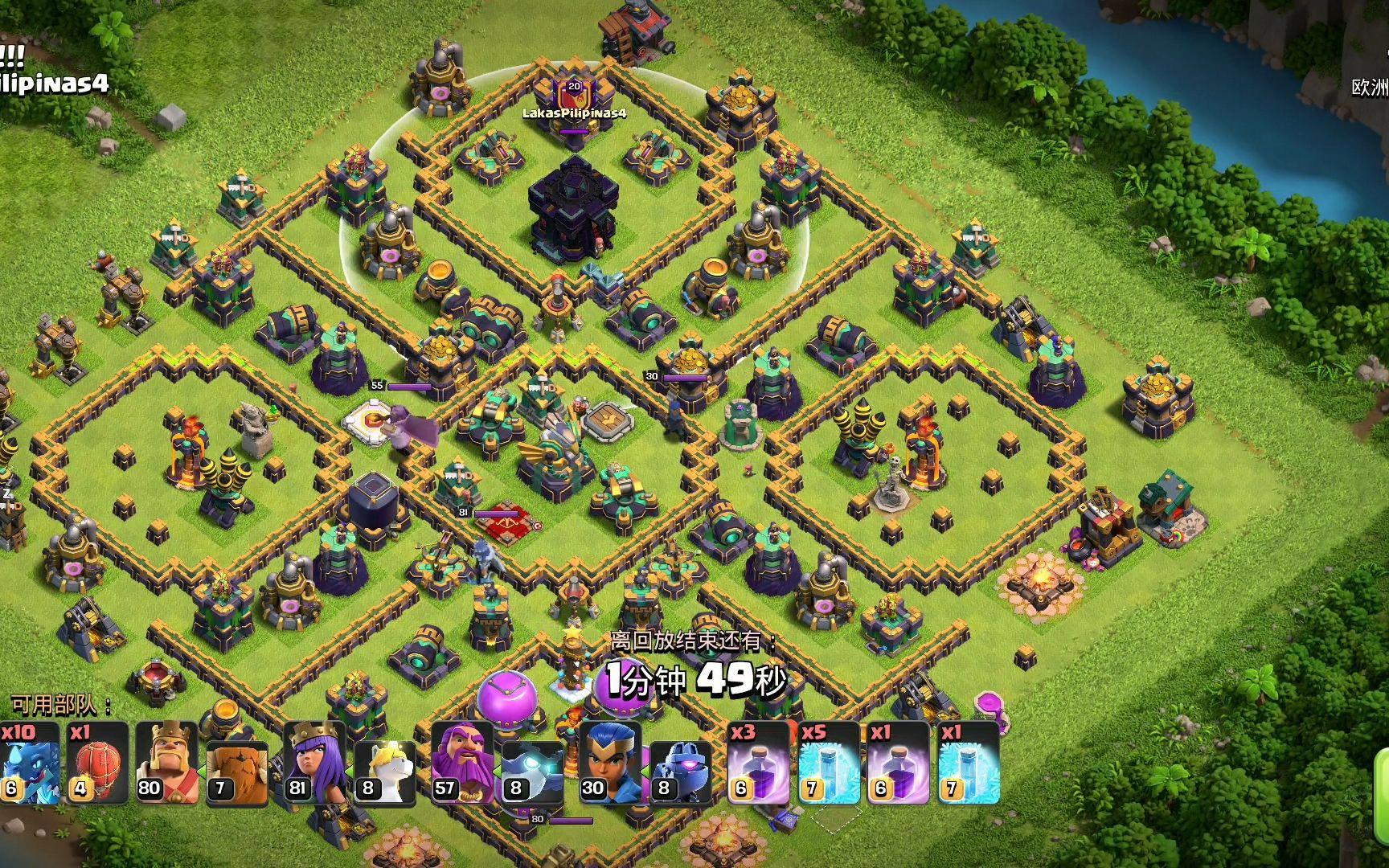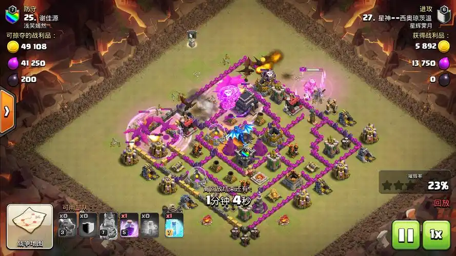 细节把控决定地狱流的成败,部署地狱飞龙时需避开空气清扫器射程,防止其推回重置伤害叠加,可将部队放在清扫器另一侧,或用熔岩猎犬吸引清扫器注意力。法术释放要精准,冰冻法术优先留给多头地狱塔、投石炮与超级法师塔等高威胁防御,狂暴法术覆盖地狱飞龙集群区域,最大化伤害输出,极速法术用于部队快速转场或突破密集防御区。面对不同阵型需灵活调整,开放式阵型可集中地狱飞龙走一路快速推进,密集阵型则分两路包夹,用气球与亡灵清理边角,确保主力部队直击核心,同时预留部分气球与亡灵用于收尾,清理残余建筑与防御,避免因漏防导致进攻失败。