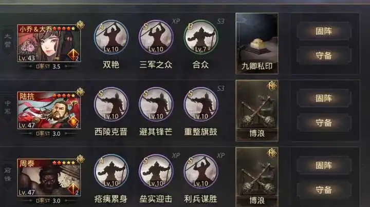 高阶同心肉队由刘备、马良、夏侯惇组成,刘备大营带桃园结义与敛众定气,快速叠加治疗效率并解除禁疗等负面状态,马良中军分摊全队伤害并触发刘备治疗增益,夏侯惇前锋承伤反击,整套阵容形成减伤、分摊、治疗、解控的完整闭环,越打越肉且无惧控制与持续伤害,驻守与阵地战表现极强,实战中需避开与张机等同治疗核心同队,避免战法效果重叠导致续航浪费。