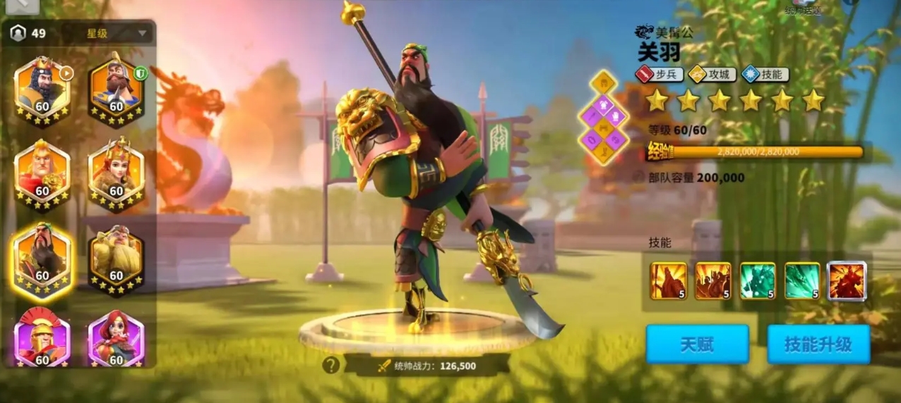 开启双英雄组合的前提是主将星级达标,只有三星及以上的武将才能解锁副将配置栏,进入部队编队界面后,符合条件的主将头像右侧会出现添加副将的标识,点击即可从武将列表中挑选副将,副将的属性与技能会按固定比例附加给部队,但天赋效果仅以主将为准,主将的统帅值决定部队基础带兵量,副将统帅值会有部分叠加,因此优先选择高统帅武将担任主将,能提升部队整体兵力,主副将等级差不宜超过10级,否则低等级武将的属性加成会出现衰减,日常需通过打野、远征、经验书分配等方式,同步提升主副将等级,保证加成效果完整。