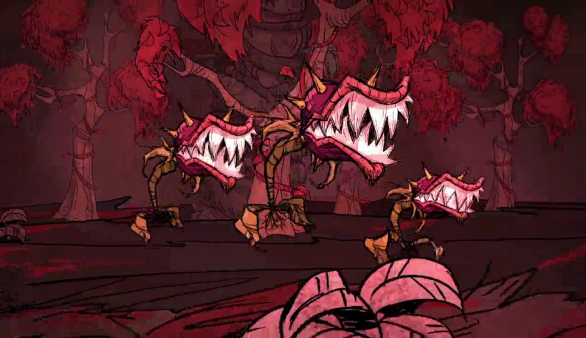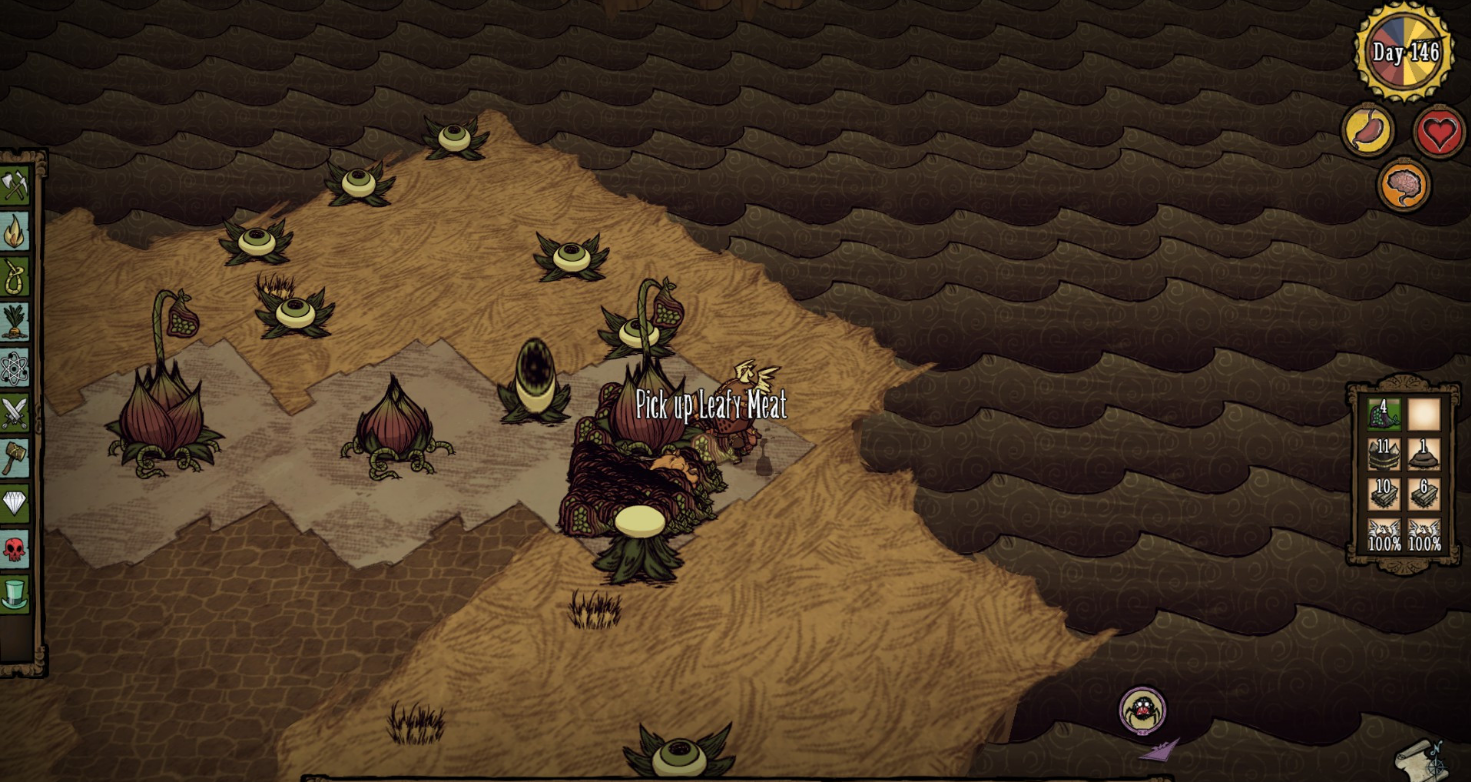食人花看似是一种可以利用的资源,但实际上它的危害远大于收益。食人花会在春季自然生成于玩家探索过的区域,生成后两天内长出根并散布眼球草。这些眼球草会吞噬附近的物品并传输到食人花的库存中,但食人花每20秒会消化一个物品,若库存已满,新传输的物品会立即销毁。这种机制看似能自动收集资源,但实际效率极低且不可控,尤其当玩家需要特定物品时,食人花的无差别吞噬反而会成为负担。