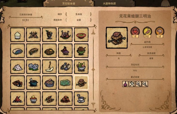 从设计角度分析,食谱指南体现了开发者鼓励探索的理念。它既保留了玩家自行发现配方的乐趣,又通过记录功能减轻了记忆负担。这种平衡设计让烹饪系统既具有深度又不会过于复杂,是饥荒游戏机制中的巧妙设计之一。