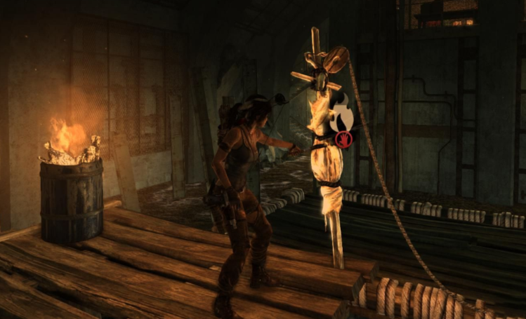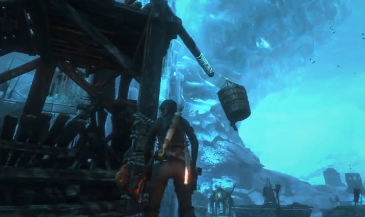 水位涨起来后从门洞游回木筏房间,借助木筏跳上高处入口。这时候再用绳索箭矢拉开内侧的木栅门,进去后可能还会遇到更多变异人,耐心清理干净。走到水坑另一边拉动开关提高水位,站在木筏上用绳索箭矢把木筏和水车转轴相连,等木筏靠近水车时抓住时机跳上高台。