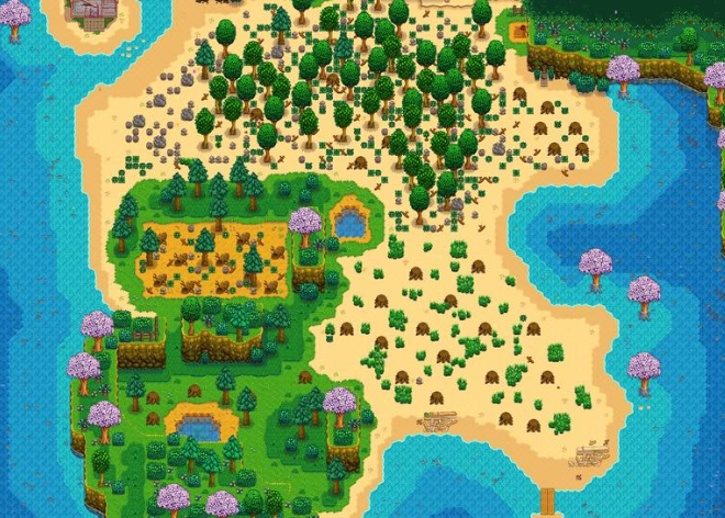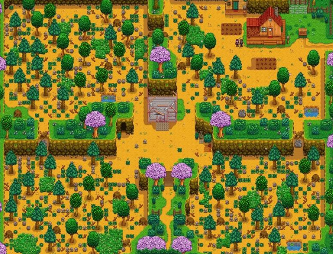 森林农场的特点是西部有一片固定刷新硬木的森林区域,每天可采集8个大木桩和季节性物品。耕地面积中等,但森林区域无法种植作物,仅能用于建造部分设施。硬木资源在游戏前期较为稀缺,选择该农场能缓解材料压力。水源分布合理,适合结合采集与种植的混合玩法,但需注意森林区域的野草可能干扰作物生长。
